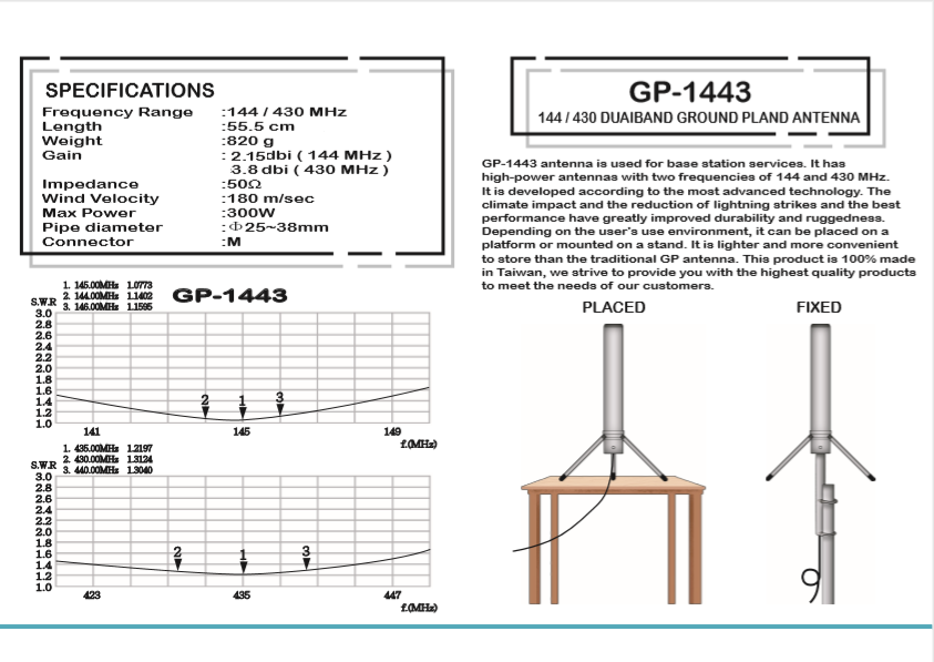 機種名稱:GP-1443 頻率:145/435MHz 增益:2.15/3.8dbi 駐波比:<1.5 承受瓦數:300W 歐姆:50Ω 重量:0.82KG 長度:55.5CM 耐風速:180m/sec. 安裝管徑Φ36-44mm 接頭種類:N/M